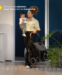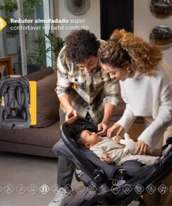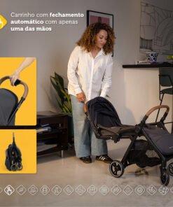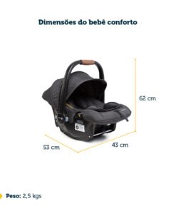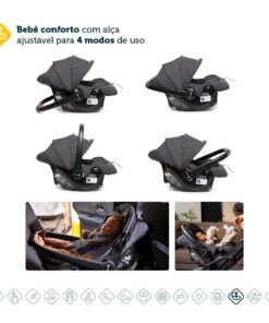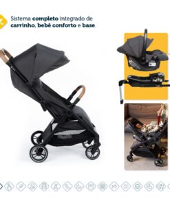 qualquer tipo de rotina! – Sistema completo integrado de carrinho, bebê conforto e base. – Revestimento com toque extra macio – Redutor almofadado super confortável no bebê conforto – Carrinho com assento acolchoado com toque confortável – Carrinho com fechamento automático com uma mão só, super compacto. – Estrutura em alumínio, super leve e fácil de transportar – Manopla e barra frontal do carrinho revestidas com tecido especial, confortável e com um toque de estilo. – Bebê conforto com barra de cinco modos de usos diferentes – Integração perfeita entre carrinho e bebê conforto. – Ajuste do assento do carrinho em quatro inclinações e apoio de pés regulável em duas posições , o que f or melhor para seu pequeno – Para passeios longos, o carrinho pode ser levado no bagageiro do avião e o bebê conforto tem uso aprovado em aeronaves (consulte companhia aérea) – Mesmo compacto, o carrinho oferece um cesto amplo para guardar o que precisar – Base 4safe com Isofix, instalação prática e segura em qualquer veículo (consulte manual) – Amortecedores nas quatro rodas e rodas dianteiras que giram 360°, para passeio suaves – Freio centralizado em um único ponto – Capota com proteção UV50+ e aba de sol, tanto no carrinho quanto no bebê conforto – Do nascimento até os 15kg no carrinho e até 13kg no bebê conforto (Até 22 kg pelas normas internacionais).