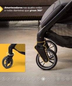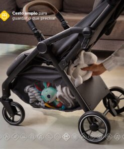bem amplo para guardar o que for preciso. Tudo isso aliado a itens de segurança: o carrinho possui amortecedores nas 4 rodas, que torna o passeio em