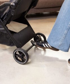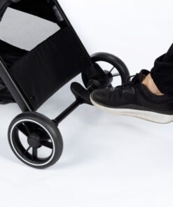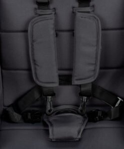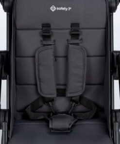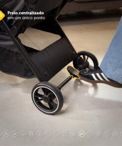 qualquer superfície mais suave, e também conta com cinto de segurança de cinco pontos, que se ajusta tanto na largura quanto na altura. O freio do carrinho