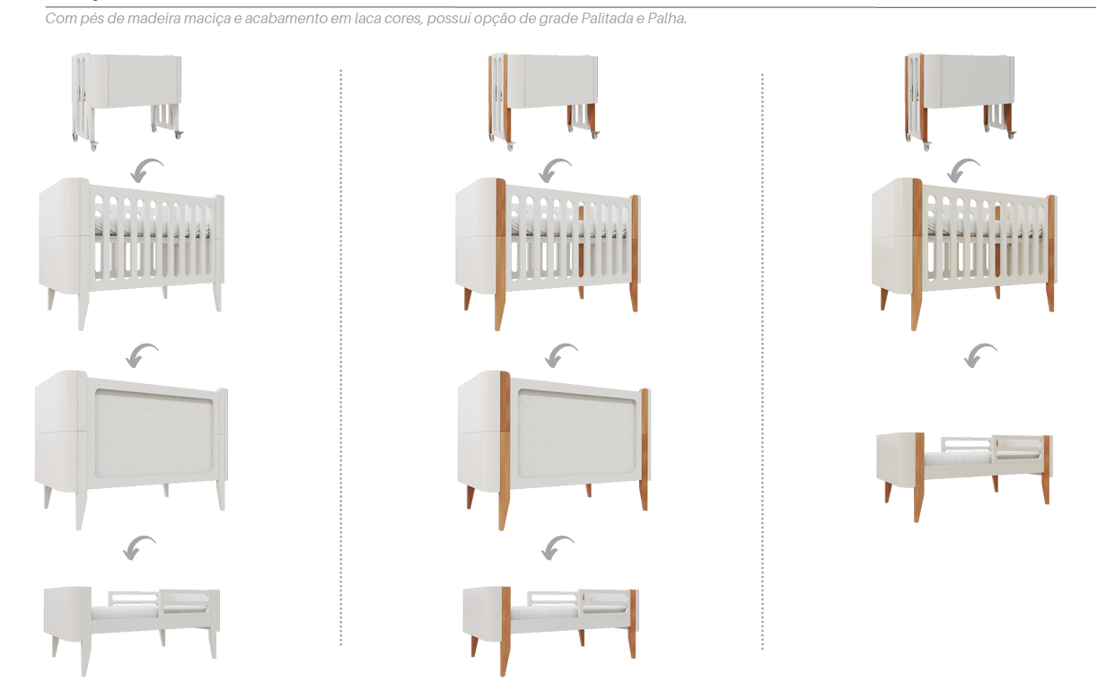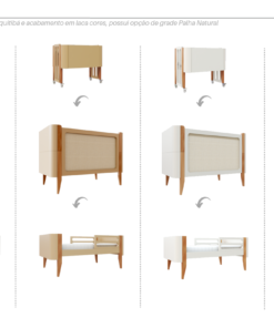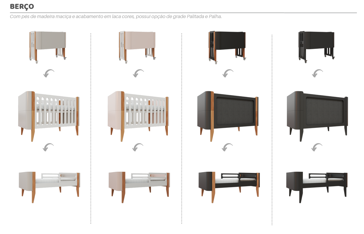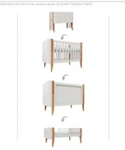 - O berço tem a possibilidade de se transformar em mini cama e mini berço (kit para transformação incluso);