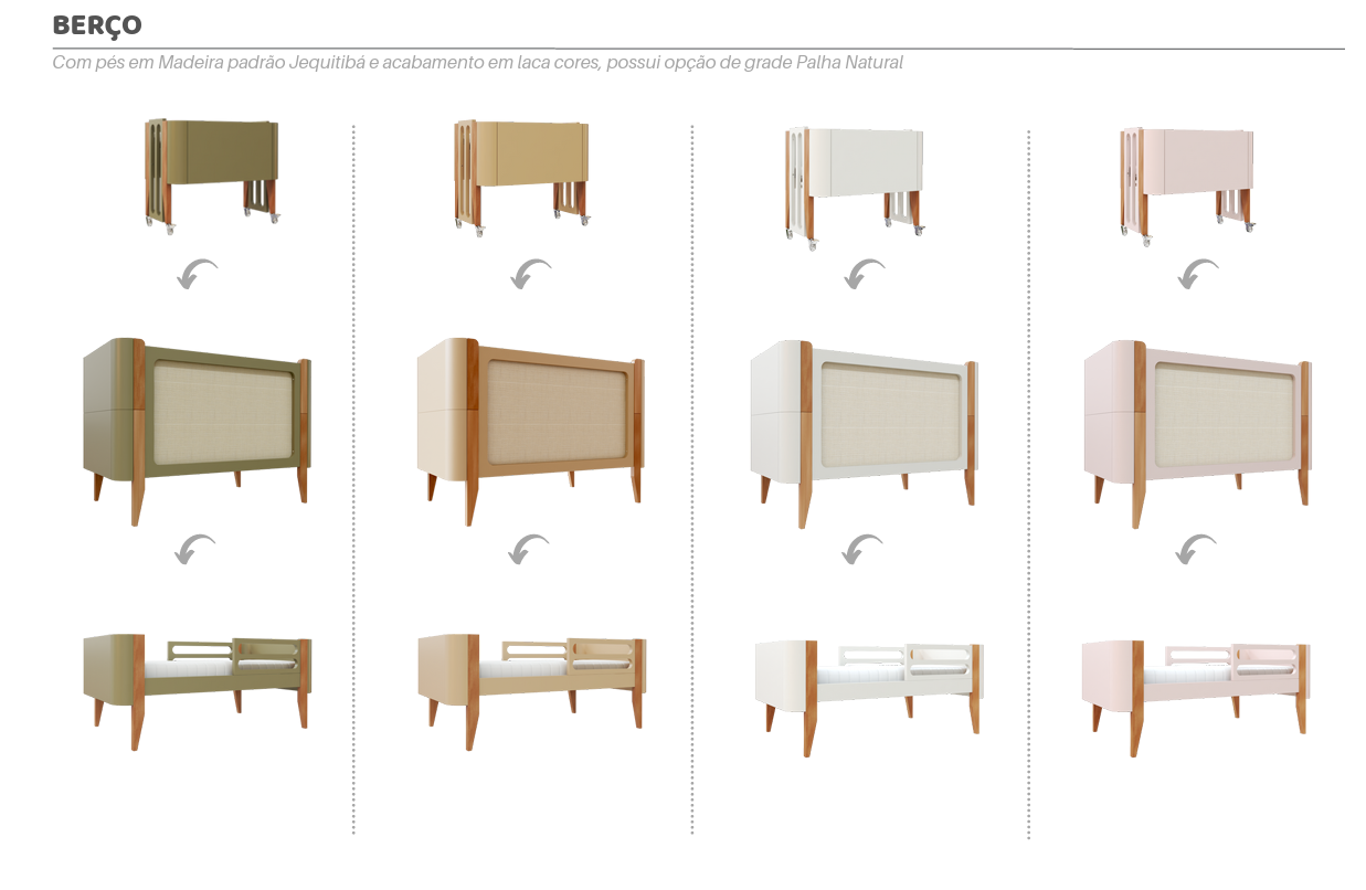 Com a escolha do Berço Bo. 3 em 1 não tem como errar. Além do design moderno, ele possui a versatilidade em se transformar em mini berço, berço e mini cama com seis opções de cores encantadoras.