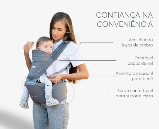 - Produto 3 em 1 – pode ser usado separadamente como suporte macio, assento de quadril ou acoplado como suporte com assento de quadril. Inclui capota solar removível, bolso frontal adicional e material em malha respirável. Embalagem luxuosa em caixa para presente, perfeita para mimos especiais.