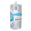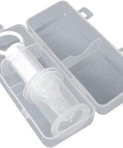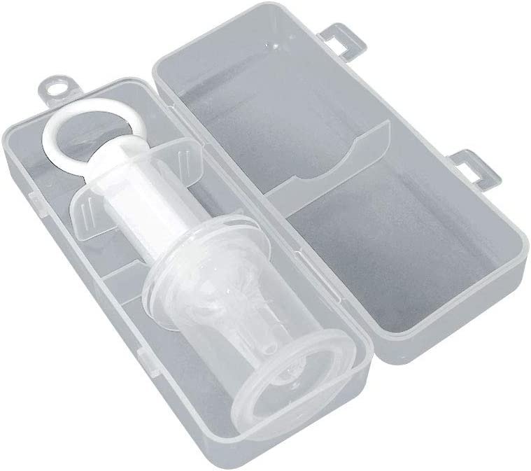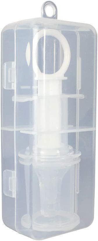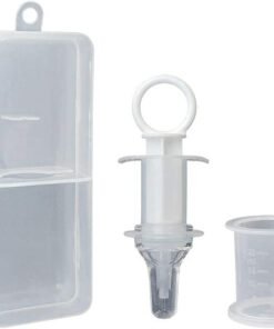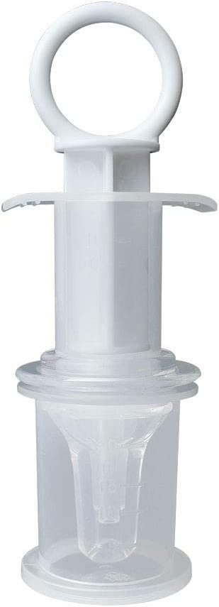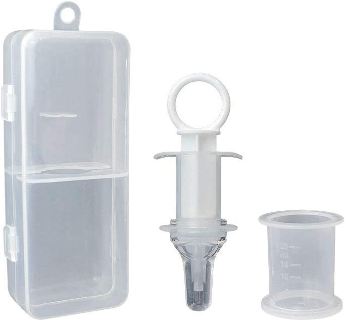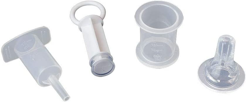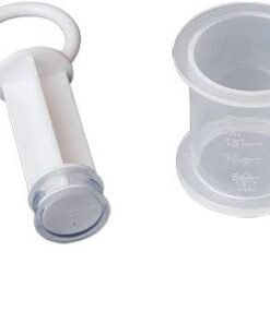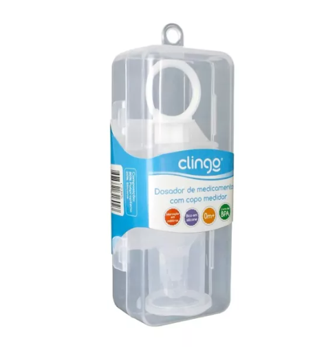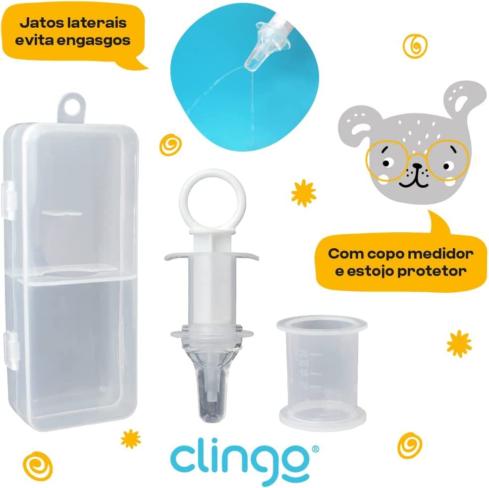 Formato anatômico de seringa com marcação até 10ml, possui bico de silicone macio, copo medidor com marcação de até 20ml.