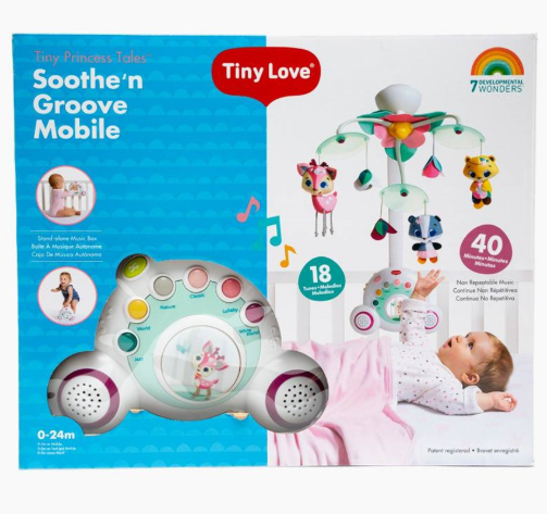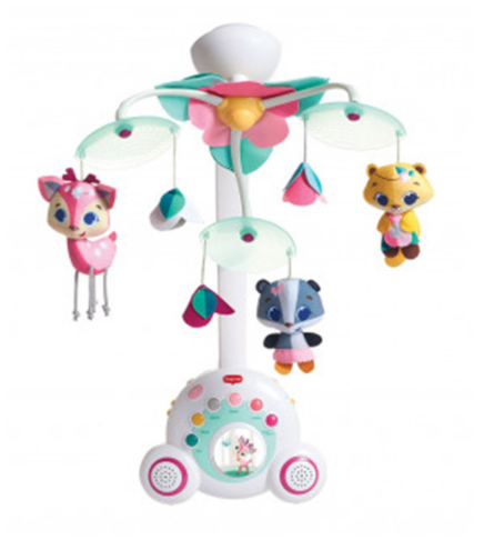 Este item 2 em 1 cresce com a criança, servindo como móbile de berço e depois como uma caixa de música portátil, com 18 melodias em 6 categorias.